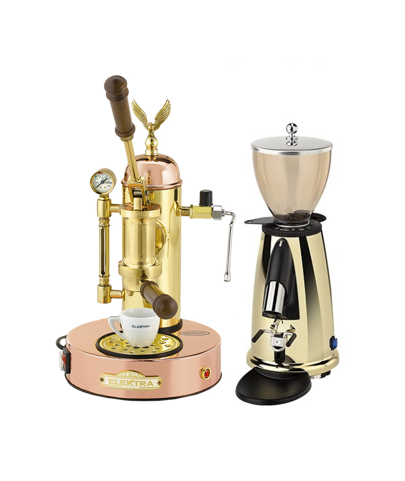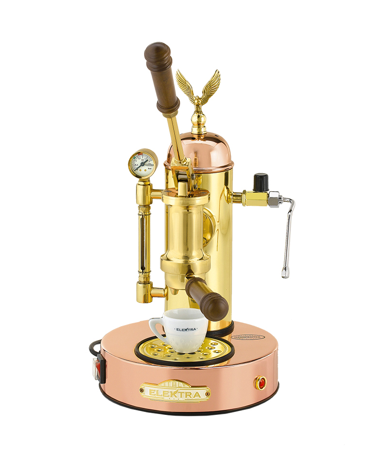 Elektra propone la macchina da caffè Micro Casa a Leva da vari decenni. I motivi sono da ricercare nella particolarità del design e nel funzionamento a leva che sono riproposti secondo la più antica tradizione delle macchine da caffè espresso. Realizzate in tre versioni: Rame Ottone, Cromo e Ottone e Cromo. La linea è completata da macinadosatori professionali nelle varie versioni cromatiche e da basi di legno con cassetto battifondi.