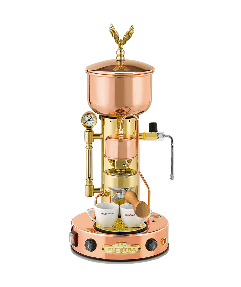 Una vera macchina da caffè professionale che ha il pregio di racchiudere in antiche forme l’attuale tecnologia di costruzione, per soddisfare le esigenze di praticità di chi la utilizza. Il vaporizzatore genera un inesauribile vapore per il più schiumoso dei cappuccini, per the ed infusi. Il gruppo professionale ad erogazione continua è realizzato in ottone e la caldaia sempre in ottone è provvista di scambiatore di calore.
