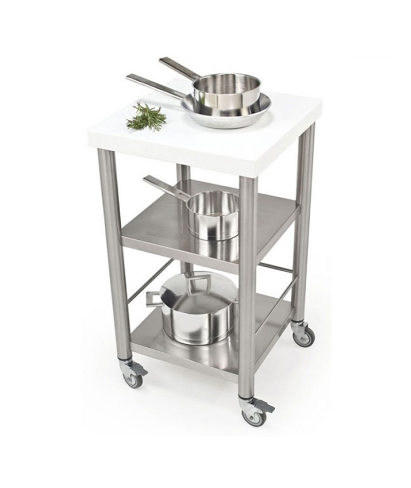Carrello da cucina in Corian bianco con due ripiani inferiori e senza cassetto.