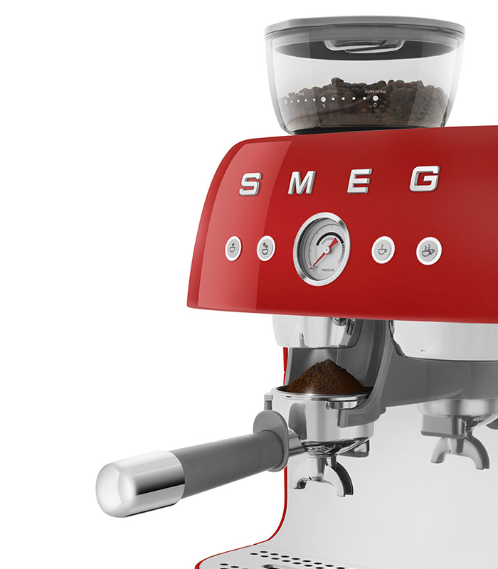 Macinacaffè integrato: il vero aroma del caffè a partire dalla macinatura effettuata al momento. Vivere la Barista Experience è possibile con la macchina EGF03 Smeg: un concentrato di tecnologie che contribuiscono alla preparazione di un caffè ottimale. Per una macinatura omogenea il macinacaffè integrato è dotato di macine coniche in acciaio inox, che consentono di impostare la macinatura fino ad un livello superfine. Grazie al portafiltro con diametro 58 mm e la lancia vapore professionale con due livelli vapore è possibile preparare caffè e preparazioni a base di latte come un vero barista. Mentre il manometro, consente di verificare che l’estrazione sia avvenuta in modo ottimale secondo i parametri dell’espresso.