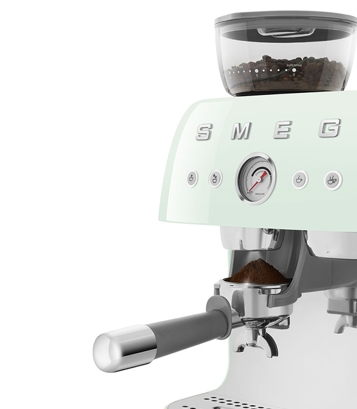 Macinacaffè integrato: il vero aroma del caffè a partire dalla macinatura effettuata al momento. Vivere la Barista Experience è possibile con la macchina EGF03 Smeg: un concentrato di tecnologie che contribuiscono alla preparazione di un caffè ottimale. Per una macinatura omogenea il macinacaffè integrato è dotato di macine coniche in acciaio inox, che consentono di impostare la macinatura fino ad un livello superfine. Grazie al portafiltro con diametro 58 mm e la lancia vapore professionale con due livelli vapore è possibile preparare caffè e preparazioni a base di latte come un vero barista. Mentre il manometro, consente di verificare che l’estrazione sia avvenuta in modo ottimale secondo i parametri dell’espresso.