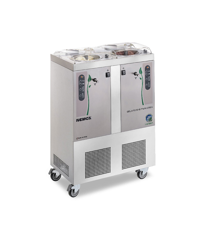 Gelato 5+5K TWIN i-Green è il mantecatore da terra che permette di preparare contemporaneamente due gusti di gelato.