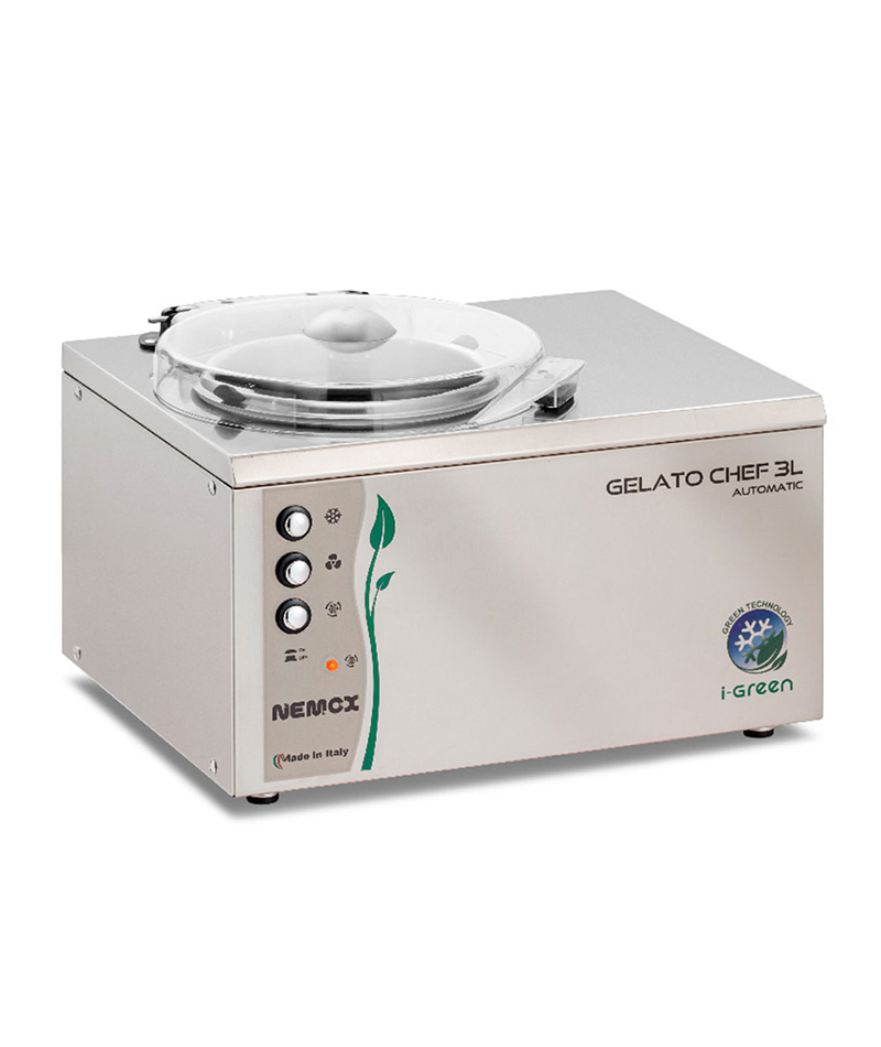 - Gelato Chef 3L AUTOMATIC i-Green è una macchina da banco super compatta realizzata in acciaio inox, dotata di funzione automatica di conservazione in vasca del gelato che permette di mantenere il gelato alla temperatura e consistenza ideale per il servizio.