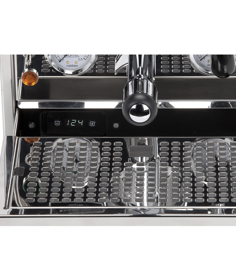 La Pro 500 non convince solo visivamente, ma anche per la sua facilità d’uso. Ha un grande vassoio per le tazze, che è completamente rimovibile, in modo facile e comodo per riempire il serbatoio dell’acqua. La Pro 500 ha la qualità di un massiccio gruppo erogatore Profitec, con un peso totale di 4,5 kg. Il sistema a due cicli consente la preparazione dell’espresso simultaneamente alla rimozione di vapore o acqua calda.
